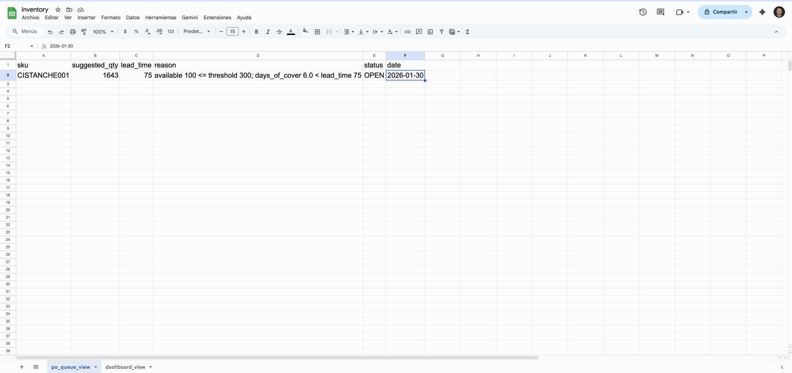 Alertas + PO queue + template. Workflow exportable (n8n) + Sheets (dashboard + thresholds).